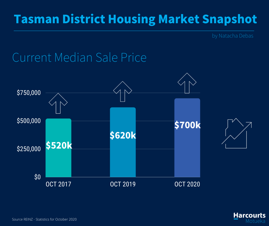 Median prices in the Nelson/Marlborough/Tasman regions increased in October 2020 when compared to the same time last year, up 10.5%, 26.8% and 12.9% respectively, with Tasman reaching a median house price of $700,000.